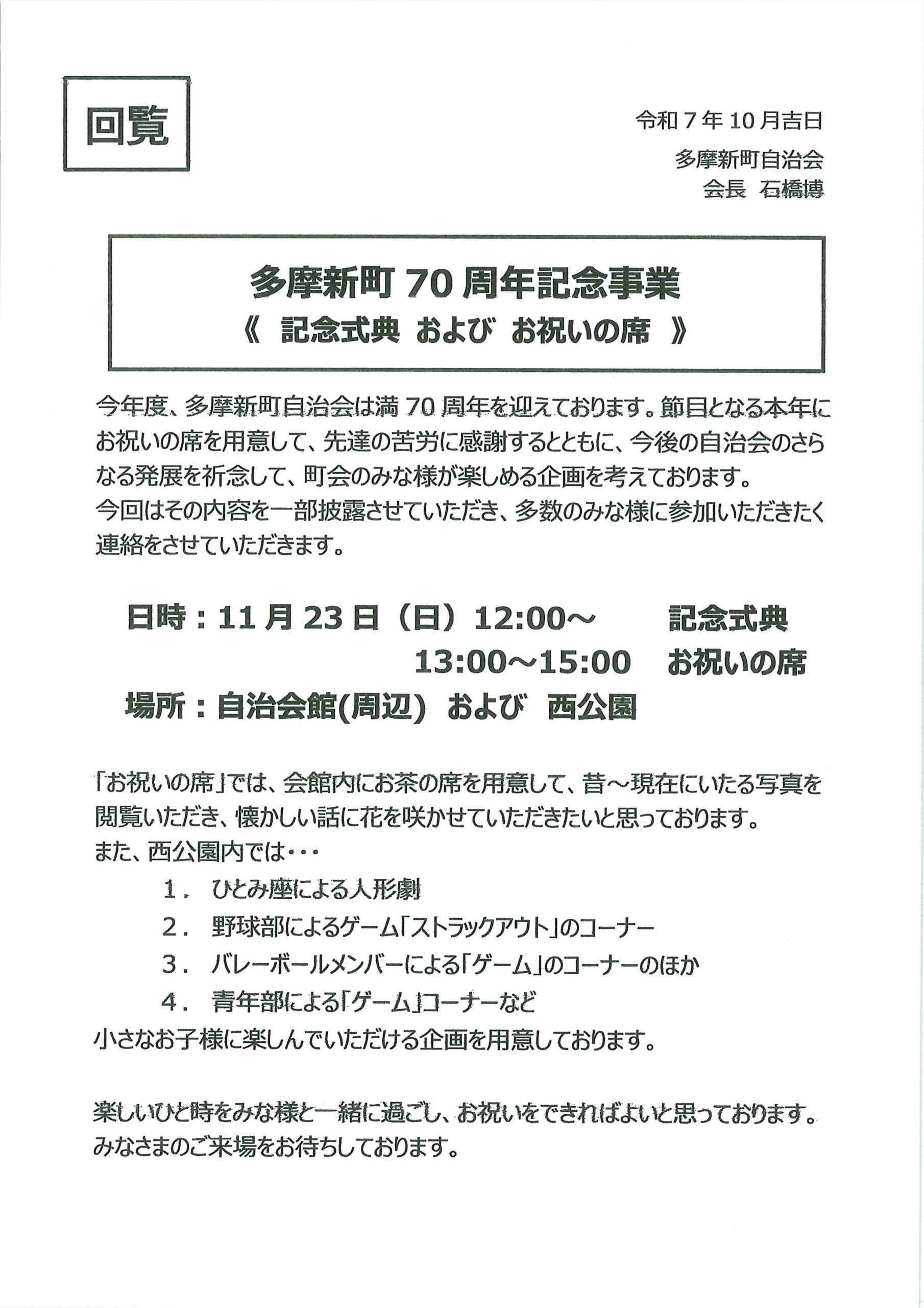 多摩新町70周年記念事業《記念式典およびお祝いの席》